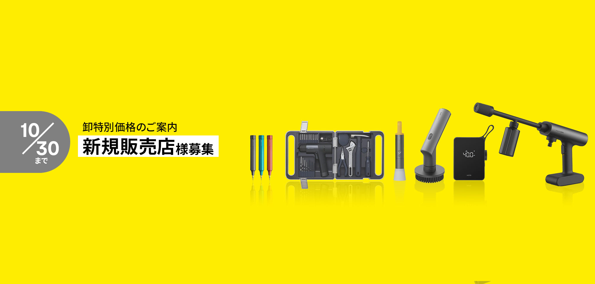 HOTO Japanでは、ただいま新規販売パートナー様を募集しております。秋のアウトドアにおすすめのライト製品や、年末に向けて需要の高まるクリーナー製品を、特別な卸価格にてご案内いたします。 これまでお取り扱いのなかった販売店様・事業者様も、この機会にぜひ導入をご検討ください。 【ブランド紹介】“ツールが生活をデザインする”をコンセプトに、暮らしに寄り添うアイテムを展開。アイデアをかたちにするための、機能的で洗練されたプロダクトを揃えています。世界的なデザイン賞を多数受賞し、日常の中に溶け込む美しいデザインと確かな使い心地で、ギフトアイテムとしても人気が高まっています。 【取り扱い実績】有名セレクトショップや大手アウトドアショップなどで取り扱い中です。 【展開事例】 https://hototools.jp/blogs/blog/bpr-beams https://prtimes.jp/main/html/rd/p/000000780.000016343.html 【販売店様特別価格】特別卸価格にてご提供いたします。ご希望の販売店様は、下記お問い合わせ先までご連絡ください。※1販売店様あたり 5台まで 【期間】2025年10月30日(木)まで 【お問い合わせ先】HOTO Japan〒105-0003 東京都港区西新橋2-35-5 荒川ビルMail:distributor@sekidocorp.com