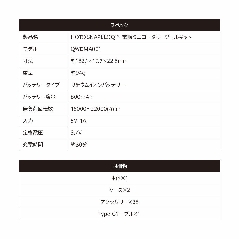 | 製品名 | HOTO SNAPBLOQ™ 電動ミニロータリーツールキット |