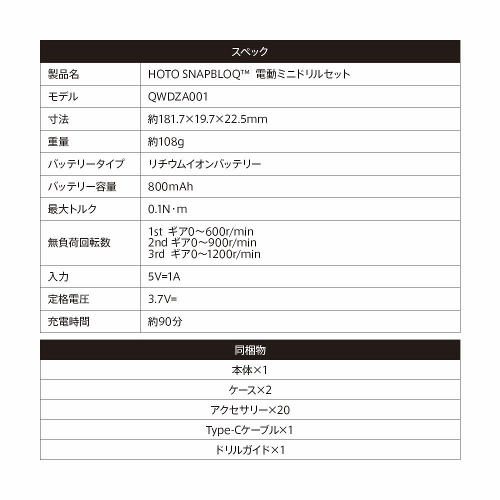 | 製品名 | HOTO SNAPBLOQ™ 電動ミニドリルセット |