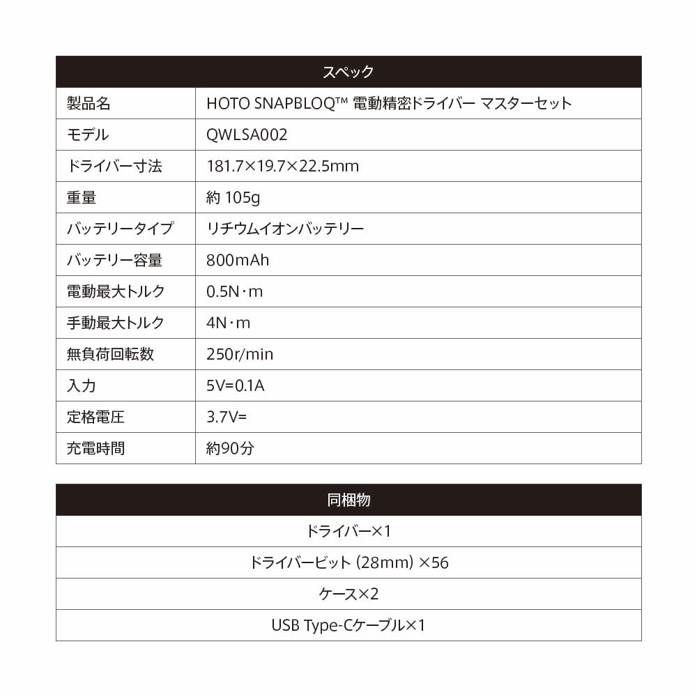 | 製品名 | HOTO SNAPBLOQ™ 電動精密ドライバー マスターセット |